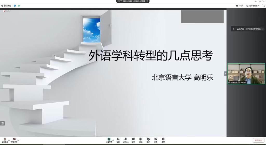 的学习氛围却丝毫没有减弱。11月11日下午,学院邀请到北京语言大学外国语学部部长﹑博士生导师高明乐教授在云端为全院教师做了一场学术讲座,题目为:外语学科转型的几点思考。讲座由院长谭燕保教授主持。