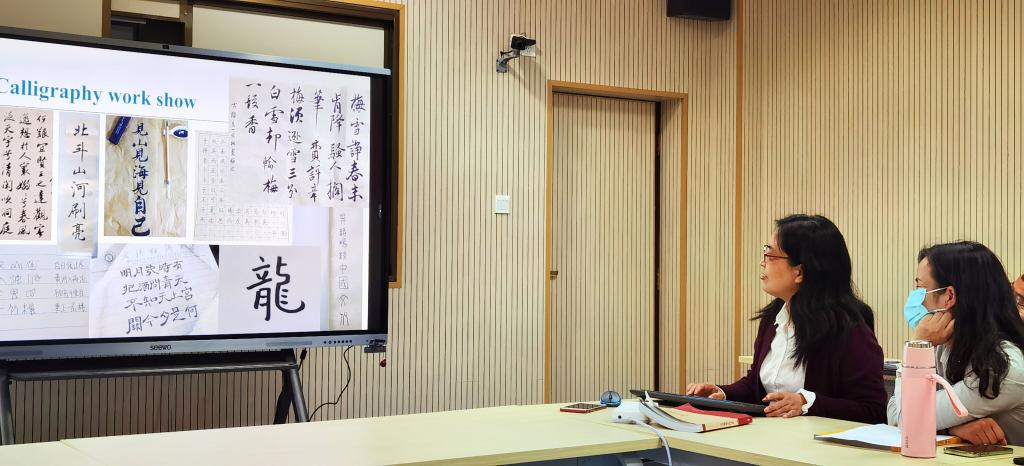 在课堂小结环节,杨老师使用了“转盘游戏”来归纳复习本次课的关键词,老师们饶有兴趣地讨论如何将这一游戏进一步优化并运用到诸如词汇复习、小组竞赛、知识抢答等活动中去。杨老师还展示了一项课后作业:学生们的书法作品。老师们看到学生的作品风格各异,内容丰富:有各种字体-行书、楷书、篆书、隶书等,写的内容有诗词、名言、祝福等,学生们不仅用自己的书法作品传达了中文的智慧和书法艺术的魅力,而且能更加自信地用英语介绍中国文字和书法。