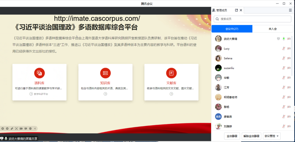 蔡倩老师分享的主题为“语料库助力大学英语思政融入”。在详细介绍了《习近平谈治国理政》与数据库综合平台的内容后,蔡老师细致地演示了如何在备课和授课过程中使用知识库规范术语和典故的表达,利用索引行助力翻译的教学和促进学生自主学习,使用词簇功能精确化词语搭配,以及如何运用文献库资源进行课堂思政元素融入等。