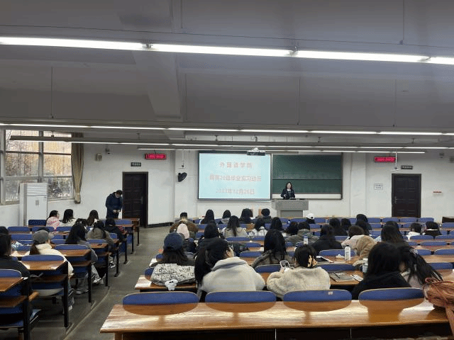 会议开始,负责商务英语专业本届实习具体工作的余桂兰老师讲述了实习的重要性、意义与要求。余老师强调指出,毕业实习是一门必修课,既是课程体系内的必修课,也是个人职业生涯开端的必修课,通过毕业实习,学生可以将课堂所学应用到实际工作场景中,尤其对于商务英语专业这门典型的学科交叉以及实践强导向的课程来说,实习的意义尤为突出。接下来,余老师详细讲解了本次实习的方式,如以分散和集体的方式,校企对接的实习单位及实习岗位细则等。介绍完毕,余老师对实习中可能会遇到的困难与问题进行了预见性讲解,赋能学生在课堂和社会的融合中找到归属感与安全感。