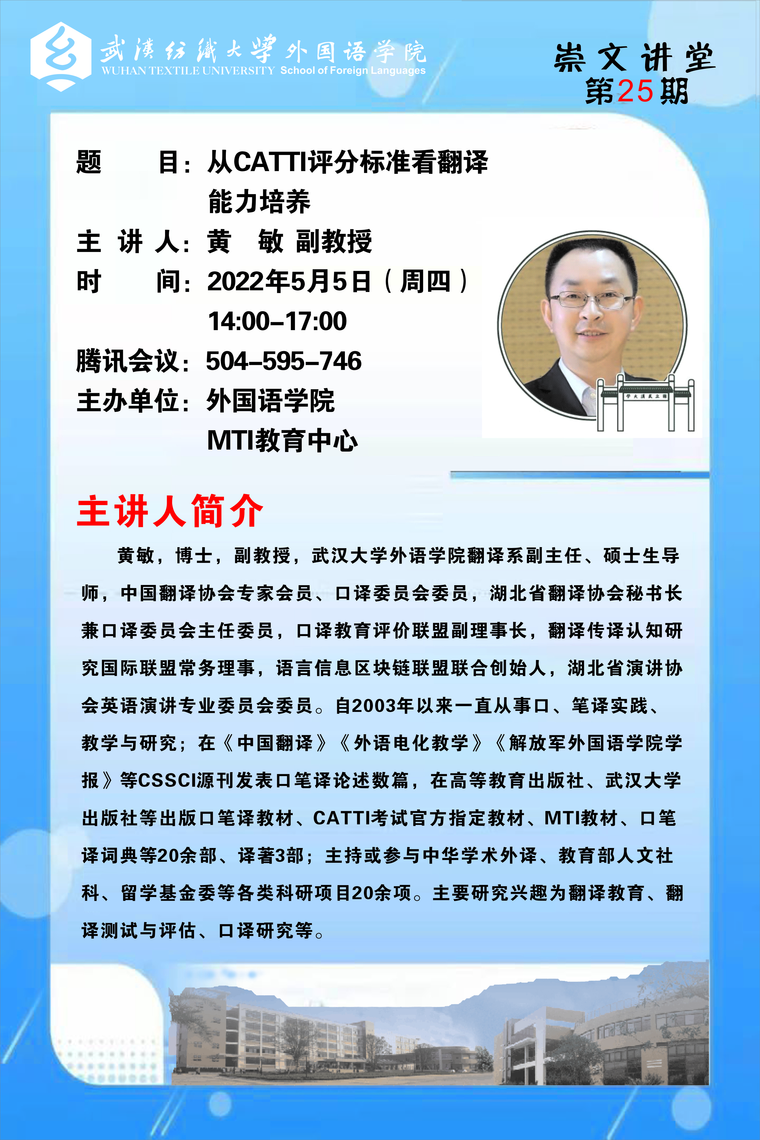 由于主讲人工作原因,原定于4月26日周二下午由黄敏副教授主讲的讲座《从CATTI评分系统看翻译能力培养》现改期举行,活动时间改为5月5日周四下午两点开始。