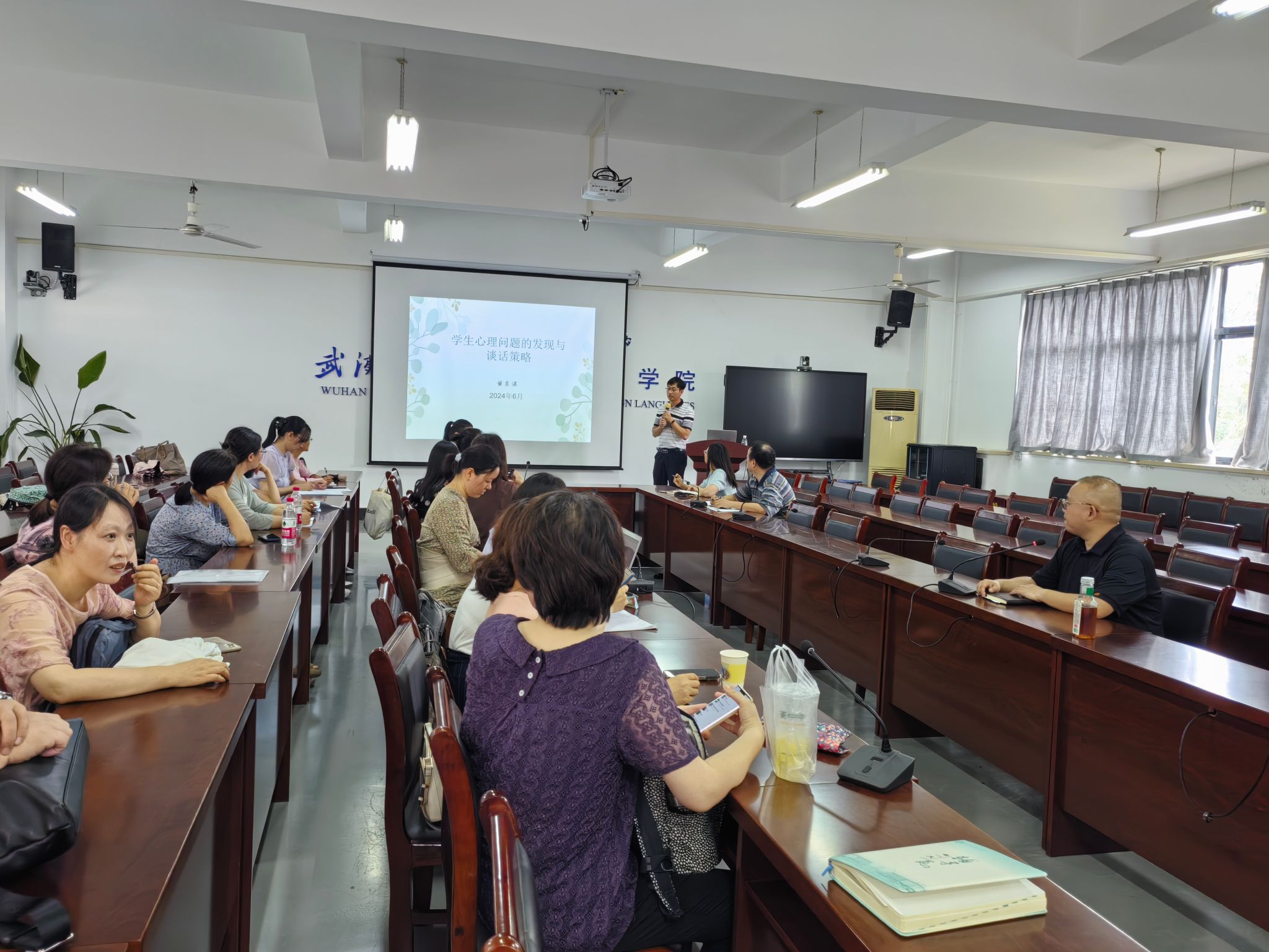 此次培训邀请了湖北大学心理健康中心黄东涛主讲,以“学生心理问题的发现与谈话策略”为主题,黄东涛从发现学生心理问题的途径、学生基本心理问题症状识别和问题线索、需关注的七类重点人群、谈心谈话的技巧四个方面进行了详细的介绍,鼓励老师们注重与学生共情,多鼓励学生表达自己的情绪,做一个忠实的倾听者,并在合适的时候给予学生指导和建议,帮助学生解决问题、化解危机。