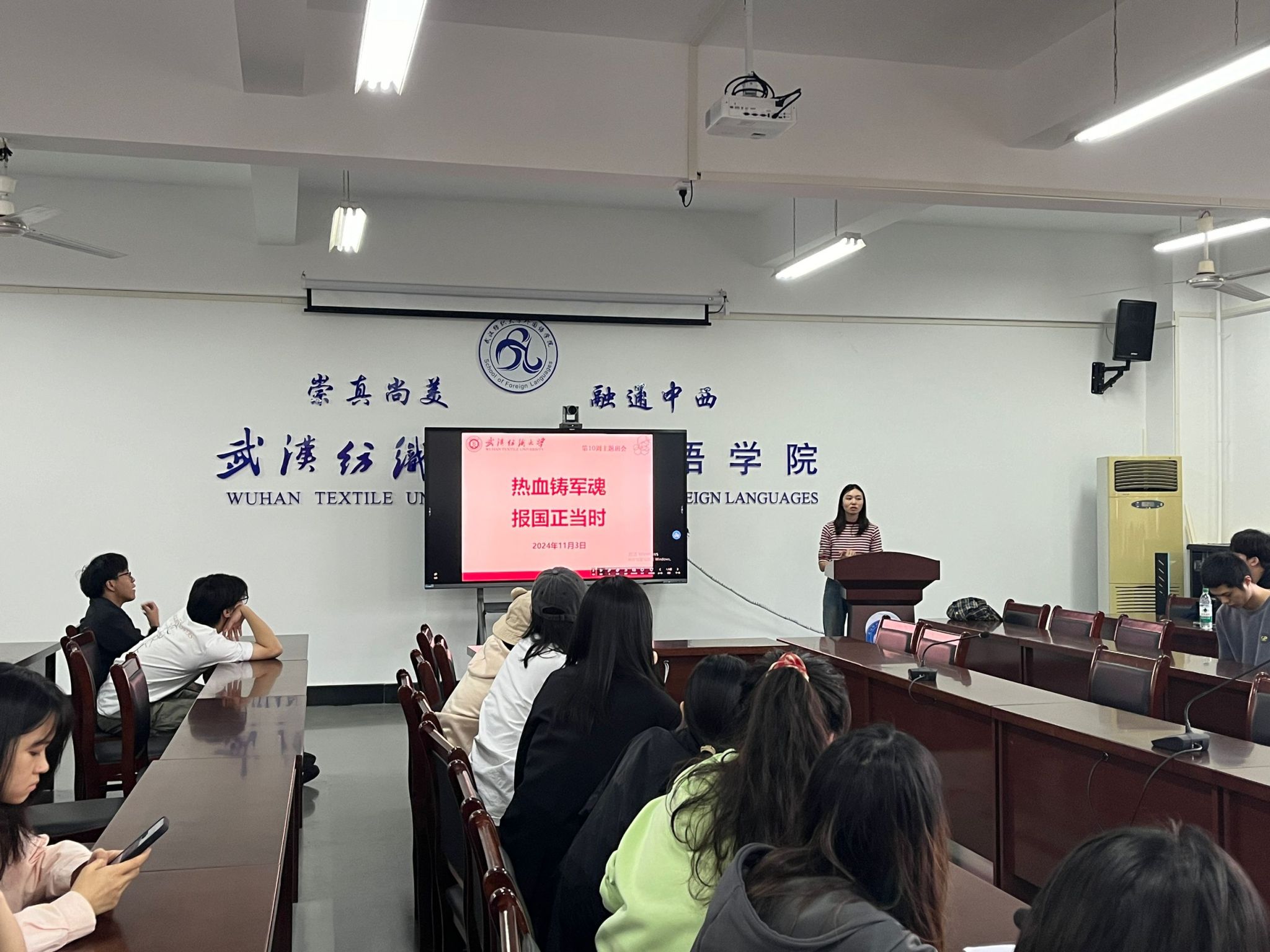 11月10日,各年级辅导员集中进行征兵政策宣讲解读,同时邀请退伍学生士兵进行朋辈交流活动。各年级辅导员重点从优先优待、选拔培养、复学升学、退伍就业等方面进行了深入介绍,进一步促进同学了解学校征兵入伍相关政策。退役大学生士兵、商英12202班学生肖雯洁给2024级学生开展了朋辈交流活动,她以自己的军旅生涯为切入点,从参军入伍的初心、入伍的成长历练、退役后回到学校的感受等方面进行分享,通过视频和图片向大家展示部队生活和退伍大学生的在校情况及毕业去向,让同学们更加直观地感受到军人的风采和担当,激发了同学们的爱国热情和报国志向。