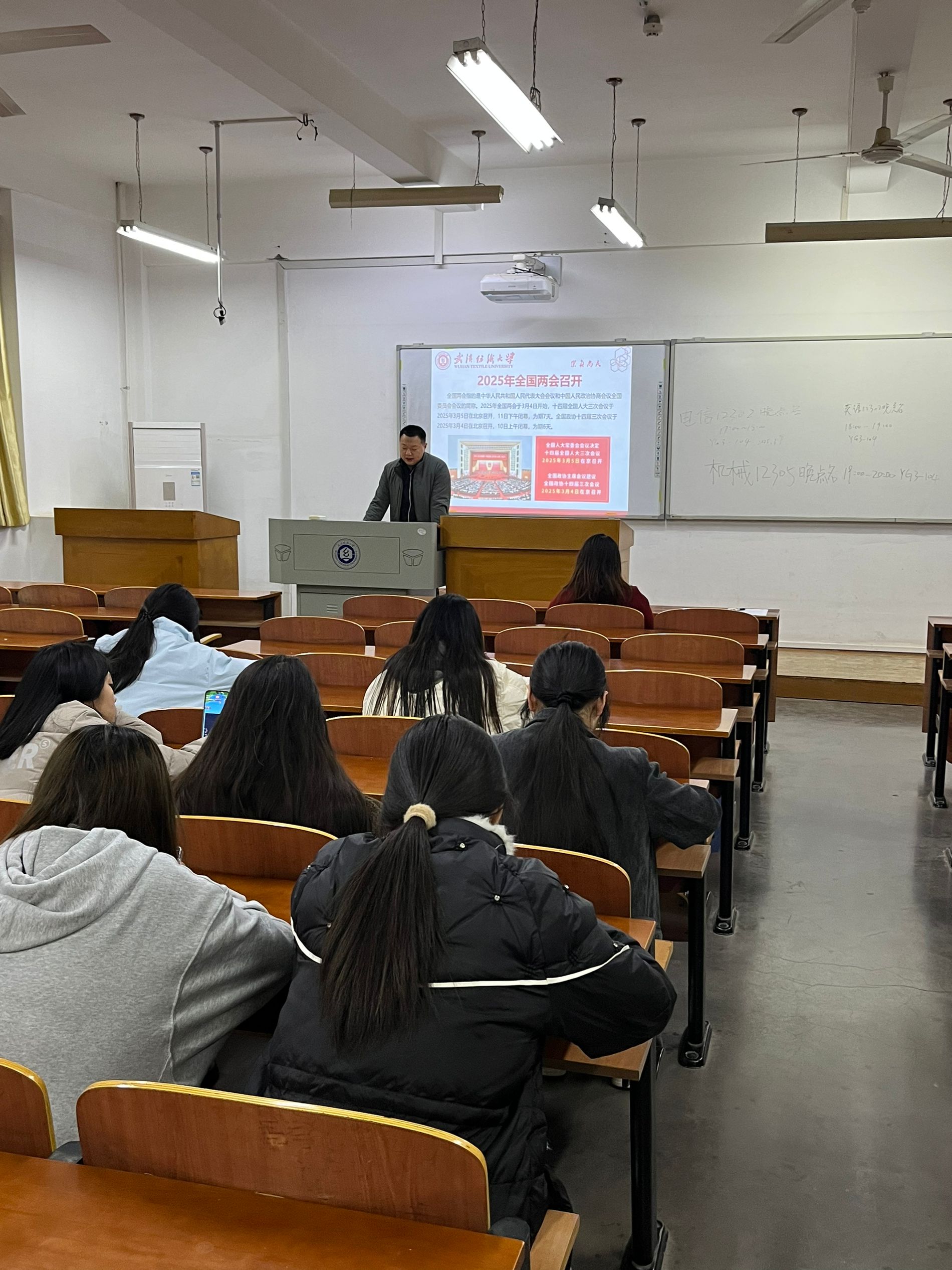 班会伊始,各班老师详细介绍了 2025 年全国两会的召开情况,向学生科普了两会的基本概念和召开流程。值得一提的是,武汉纺织大学校长徐卫林作为代表在京参会,在会上以“科技赋能纺织产业转型与高质量发展”为主题作发言,让同学们倍感自豪,进一步激发了大家对两会的关注热情。