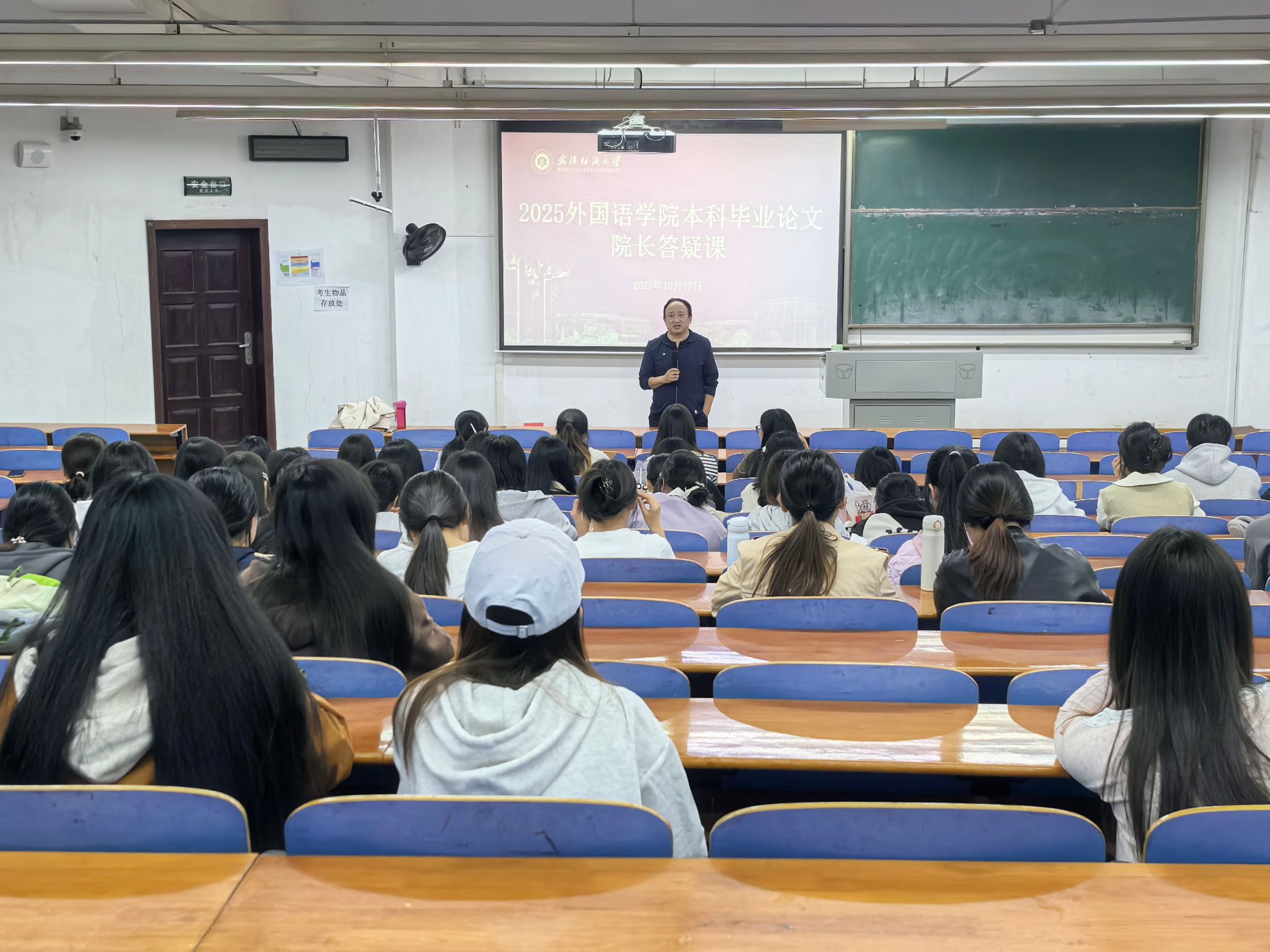 在阳光校区崇德楼T102教室成功举办了毕业论文院长答疑课。副院长罗绮伦、副书记彭阳慈航、英语系副主任田禹博士、商务英语系副主任吴凤竹老师以及全体2026届本科毕业生共同参会。