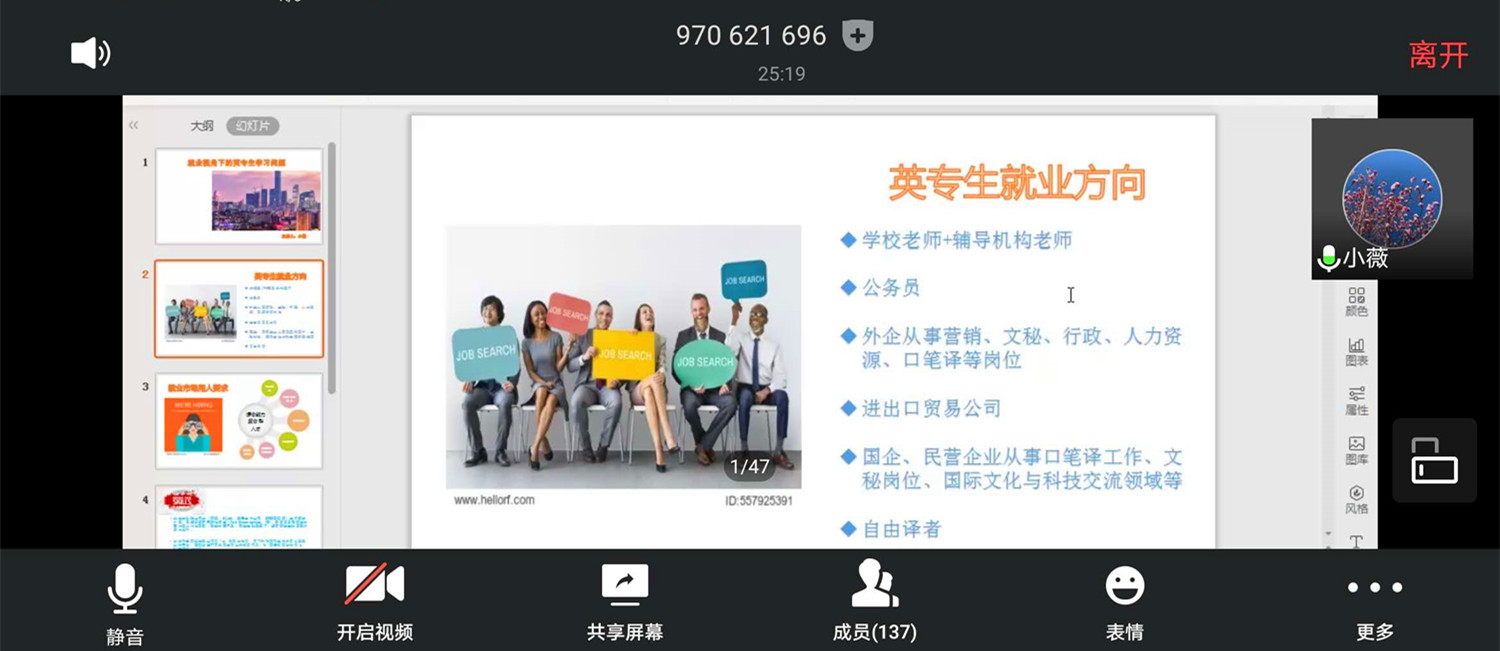 2020年成长导航讲座第一讲“就业视角下的英专生学习问题”在腾讯会议平台举行,此次受邀主讲的是自由译者邹薇,140余人参加了线上互动交流。