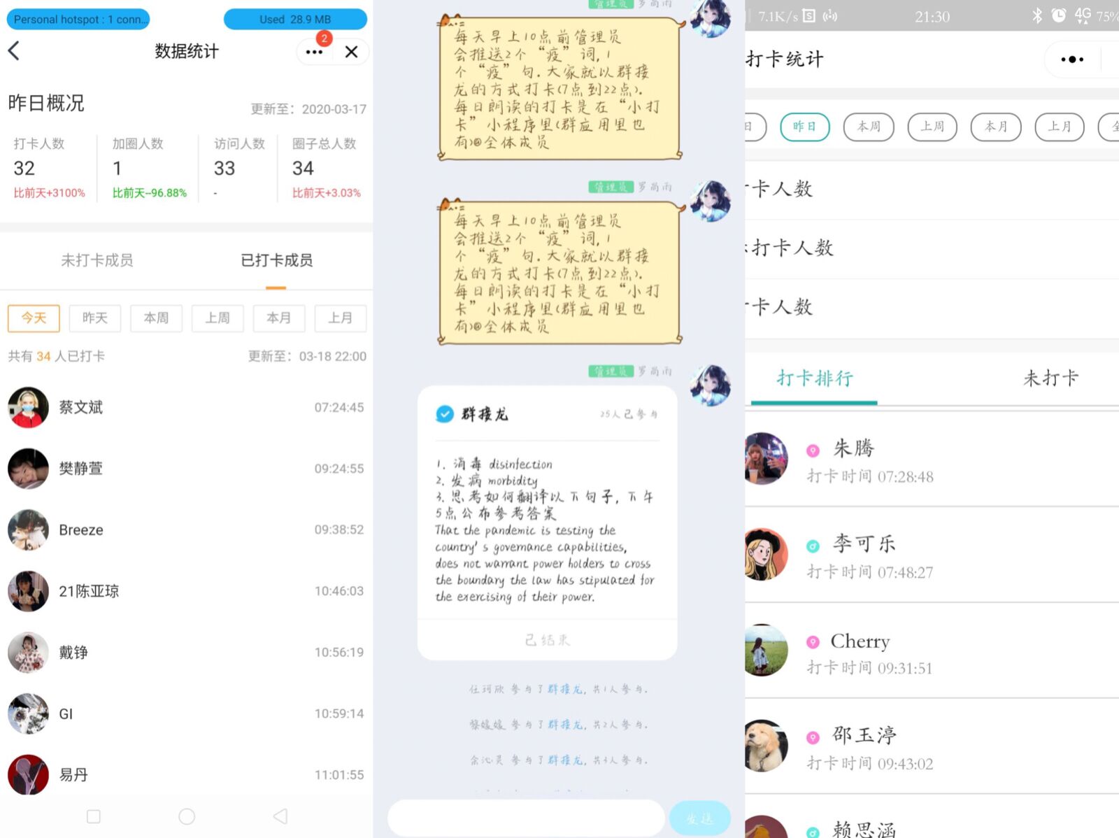 以“译”抗疫活动由“译”起朗读、每日“疫”词、每日“疫”句、每月“疫”报四个子活动构成。活动均在qq群内以班级为单位,利用“小打卡”小程序建立专门的学习圈子开展。学院遴选优秀学生代表作为各班学习团队负责人,负责各班活动的组织开展和成员打卡监督管理。这样的形式,在疫情期间,既确保了班级学风的榜样引领作用,又减轻了身负督促报平安任务的班委工作量。活动开展以来,无论是组织者还是参与者都积极性高涨,动力十足。