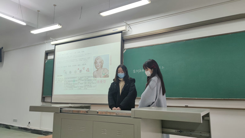 活动开始,来自服装学院的李诗怡、王嘉雯两名学生作为讲解员,引导在场同学通过对“脸部线条、身体线条、脸部量感、身体量感”四个方面进行测试,精准定位出属于自己的风格。然后以“八大风格特征”为内容,逐一讲解对应适宜的“仪态、妆容、穿搭”等技巧。
