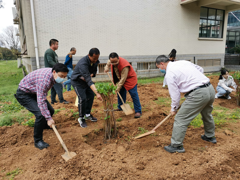 汤富华教授再次向学校捐赠了一批结香树苗,学院领导、后勤集团工作人员及全体MTI研究生在崇文楼南侧草坪参加了树苗栽种活动。