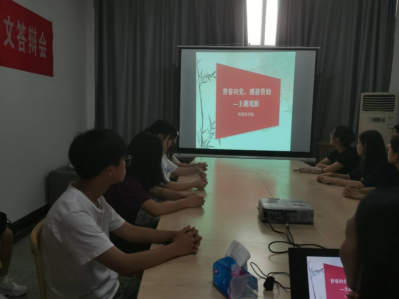 在崇文楼413会议室开展“青春向党,感恩资助”红色主题观影活动,活动由辅导员甘新敏老师主持,学院曾申请国家生源地助学贷款、获得国家奖、助学金的同学参加。