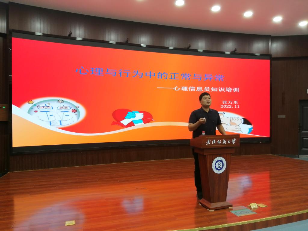 在崇志楼T201教室开展“心理与行为中的正常与异常”心理信息员知识培训会,此次培训会由学校心理咨询老师张万里主讲,学院党委副书记彭阳慈航辅导员甘新敏以及全体心理健康信息员参加了培训会。