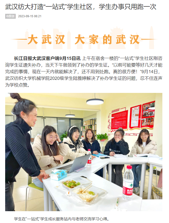 牵头建设,4个学院联合办公,被称为“一站式”学生成长服务站。上半年,武汉纺织大学改革创新学生社区综合管理模式:由一个学院“认领”一栋学生宿舍,在阳光校区13栋学生宿舍中打造“一站式”学生社区,辅导员、班级导师、专业教师、就业导师、心理导师等入驻学生社区,面对面对学生进行指导,实时解决学生的现实问题和困惑。