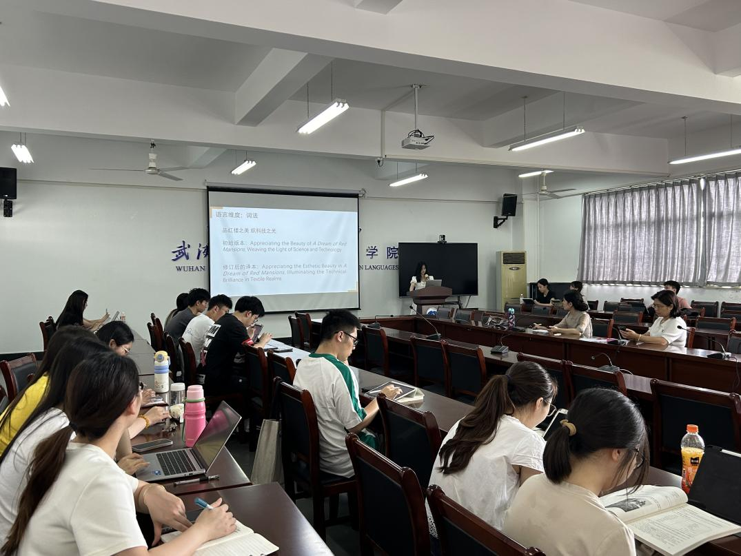 本次论坛第一位分享的同学是张露莹以《生态翻译学视角下校园新闻翻译研究——以<品红楼之美 织科技之光>英译为例》为题,从语言、文化、交际三维转换理论切入,解析高校外宣文本的翻译策略。通过对比纺大智造smart manufacturing by WTU)等案例的初译与修订版,她强调译者需在语言重组、文化意象转化(如软烟罗译为haze diaphene)、交际意图传递等层面实现生态适应性选择,为校园新闻的跨文化传播提供方法论支撑。陈韵如肯定选题有价值,建议强化受众分析;郑亚娟指出理论适用性,提醒注重细节规范(如书名斜体、章节引号等)。