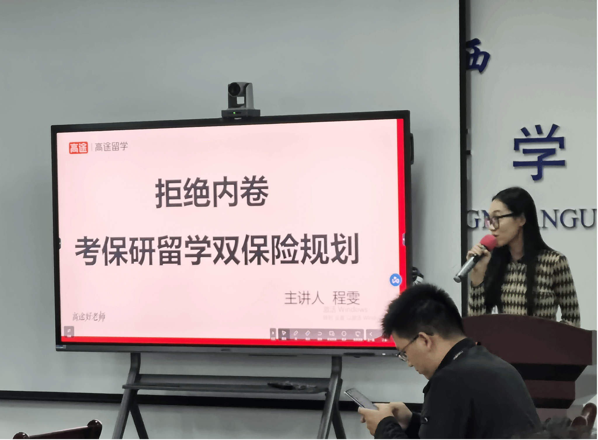 讲座过程中,学生们积极互动,提问环节更是气氛热烈。两位老师耐心地解答了学生们关于考研备考、院校选择、留学申请等方面的疑问,并给出了具体的建议和指导。