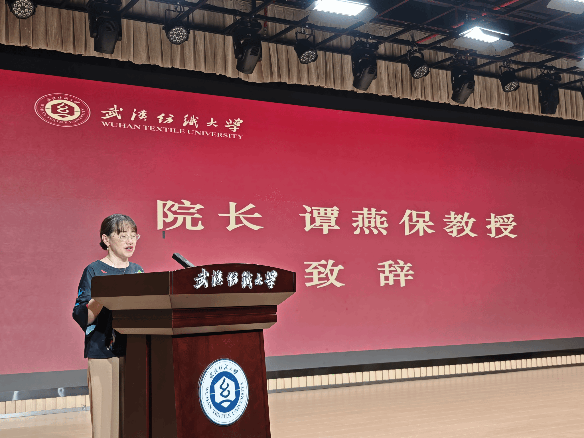 院长谭燕保教授为比赛致开幕词。她首先对来自各个学院的选手、与会嘉宾、外籍友人、师生观众表达了欢迎。她勉励在场学子,要充分利用这个宝贵机会,以青春为笔,以语言为墨,自信而清晰地表达新时代青年的独立思考;要深入理解中国之路、中国之治、中国之理背后的深厚底蕴,将所学所感转化为打动人心的中国故事。她强调,每一位学子都应勇担时代使命,努力成为沟通中外的桥梁,让世界听到一个更加真实、全面的中国。