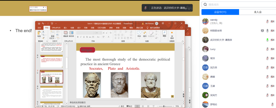 本次在线课程建设会议是继暑期课程建设启动会议后的第三次会议,与会教师结合自己的前期课程建设进展、课程资料准备情况进行了介绍。常沛教授从专业角度结合自己的线上课程建设经验,从思政课程的理论素养、用语规范、话语体系、刚性说理和柔性表达的融合等方面建议外语教师在讲授课程思政类外语课程时,在坚守政治立场、探求理论根源和构建知识图谱中把《习近平谈治国理政》的思想、理论、语言艺术等讲清楚、讲生动、讲深入,同时联系实际、实践、现实问题、国际情势等把课程思政讲活、把思政理论讲透、把用英文讲好中国故事、用英文弘扬中华优秀传统文化落到人才培养的实处、站到国家发展的高处。