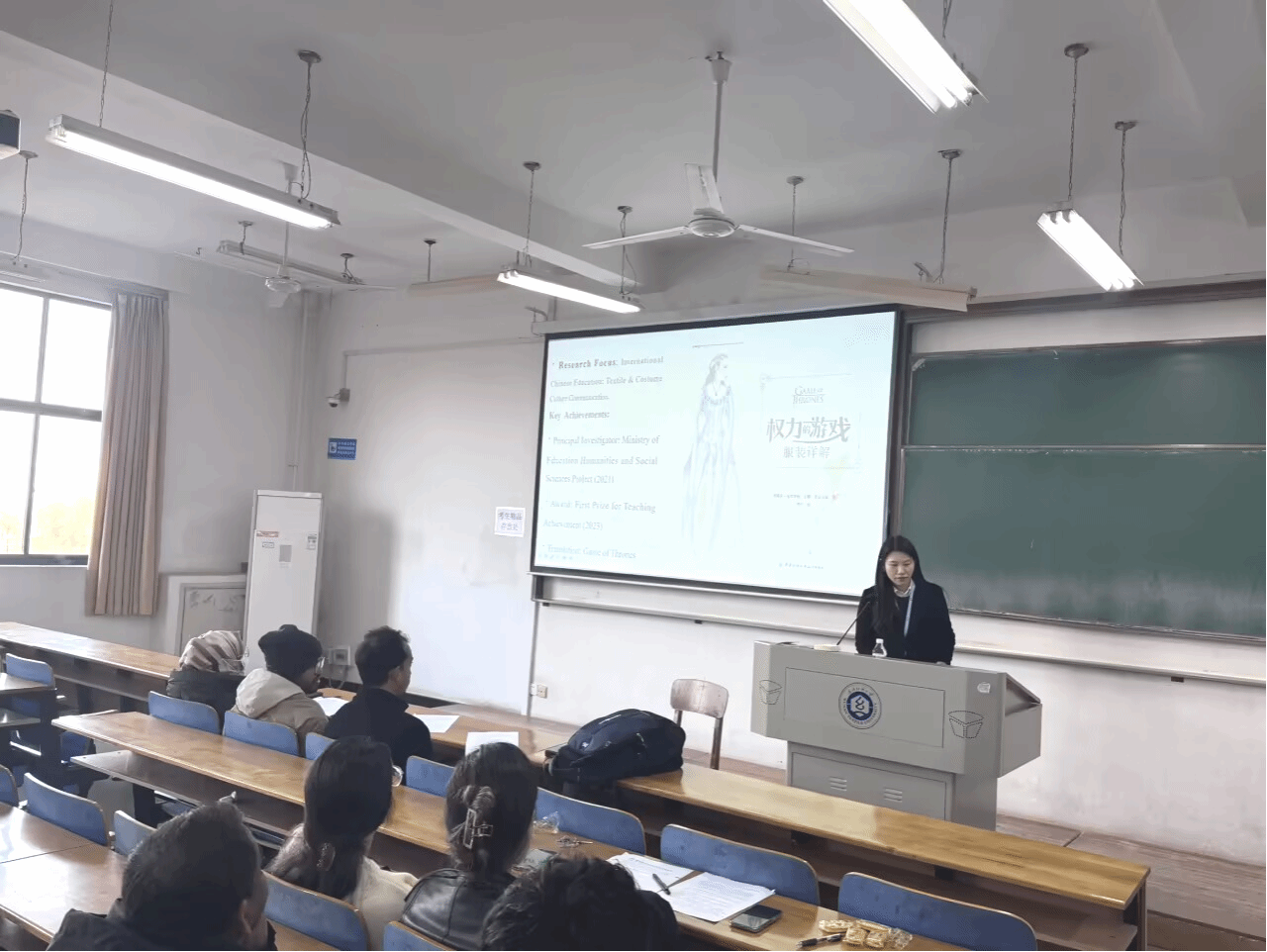 周丹教授为纺织工程专业的留学生们带来了一场题为《解码语言的经纬》(Decoding the Fabric of Language)的精彩讲座。讲座以“纺织汉语”为切入点,通过生动的双语教学与沉浸式互动,带领留学生们开启了一段探寻中华文明“经纬”的文化之旅。