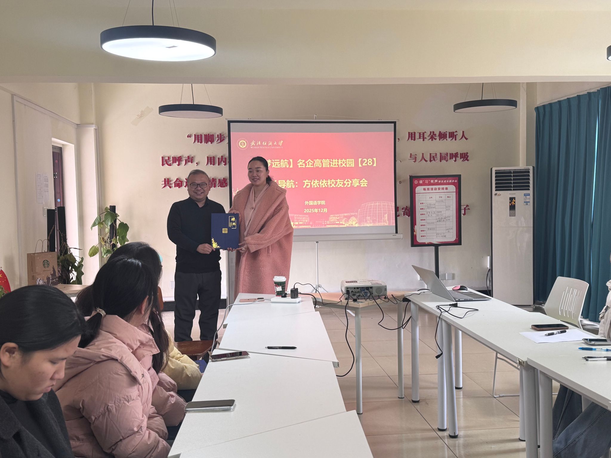 “行业学生成长导师”。彭阳慈航副书记代表学院颁发聘书,并对她带来的精彩分享与持续支持表示衷心感谢。彭书记指出,方依依女士的成长路径与事业追求,为外院学子提供了极具参考价值的生涯范例,学院将持续邀请各行业优秀代表走进校园,助力学生拓宽视野、明晰方向。